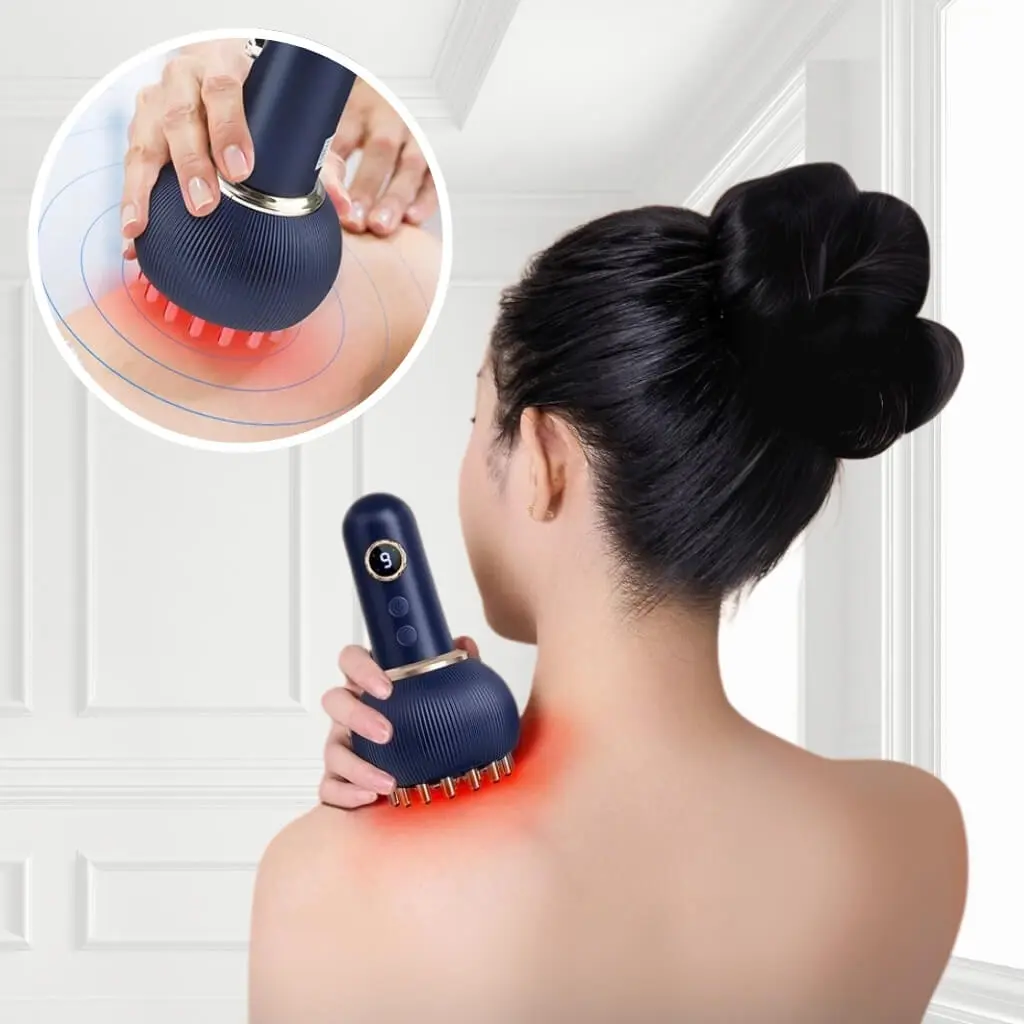 The Electric Lymphatic Drainage Massager uses advanced vibration, therapeutic heat, red light therapy, and microcurrent stimulation to enhance lymphatic drainage, improve circulation, and relieve muscle tension.